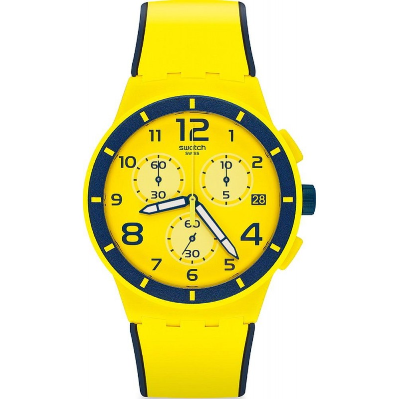 Marca: Swatch; Línea: Originals; Colección: Chrono Plastic; Modelo: Solleore; Código del Artículo: SUSJ401; Tipo de producto: Reloj; Género: Unisex; Funciones: Cronógrafo, Fecha; Tipo de Movimiento: Cuarzo / Bateria; Material de la Caja: Plástico / Resina; Color de la Caja: Amarillo; Diámetro de la Caja Ø: 42 mm; Tipo de Esfera: Analógica; Color de la Esfera: Amarillo; Material de la Correa: Silicona; Color de la Correa: Amarillo; Resistencia al agua: 30 metros / 3 bares.