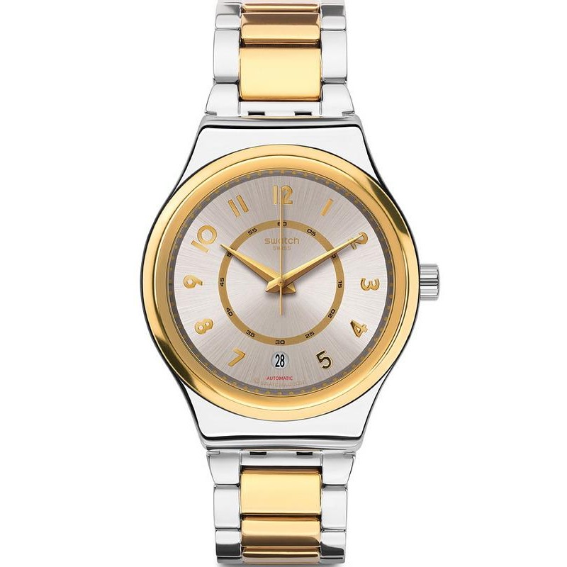 Brand: Swatch; Line: Irony; Collection: Sistem51; Model: Sistem Nugget; Article Code: YIS410G; Type of product: Watch; Gender: Unisex; Functions: Just Time, Date; Type of Movement / Mechanism: Automatic; Case Shape: Round; Case Material: Two-Tone Steel; Case Color: Steel and Gold; Case Diameter Ø: 42 mm; Type of Dial: Analog; Color of the Dial: Silver; Strap Material: Two-Tone Steel; Strap Color: Steel and Gold; Water Resistance: 30 meters / 3 bar.